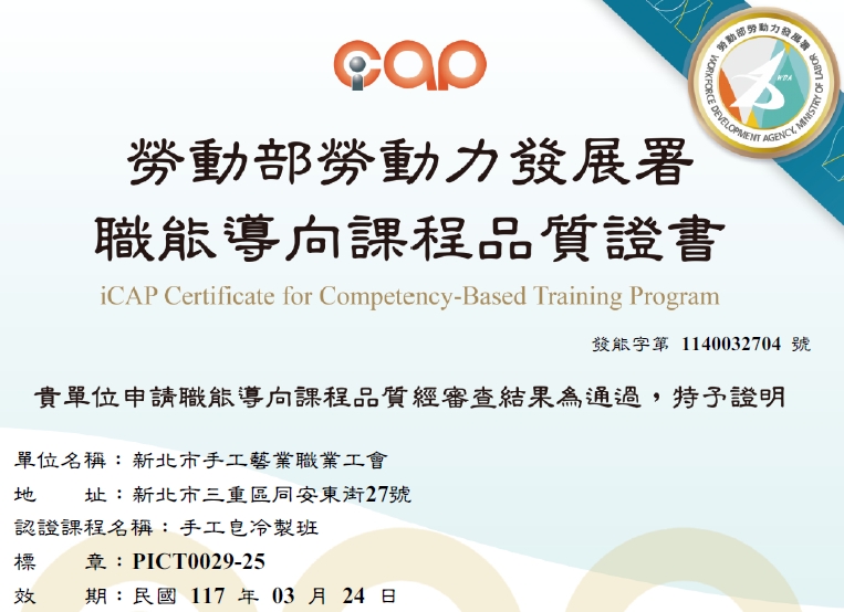 iCAP標章【手工皂冷製】職能導向課程認證 (課程技能檢定合格證)